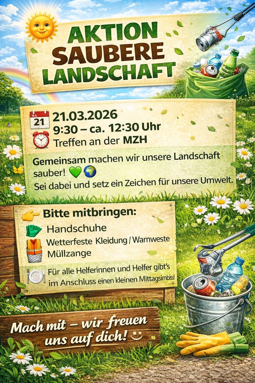 Am 21.03.2026 von 9:30 bis ca. 12:30 Uhr laden wir herzlich zur gemeinsamen Landschaftsreinigung ein.Treffpunkt ist an der MZH.
