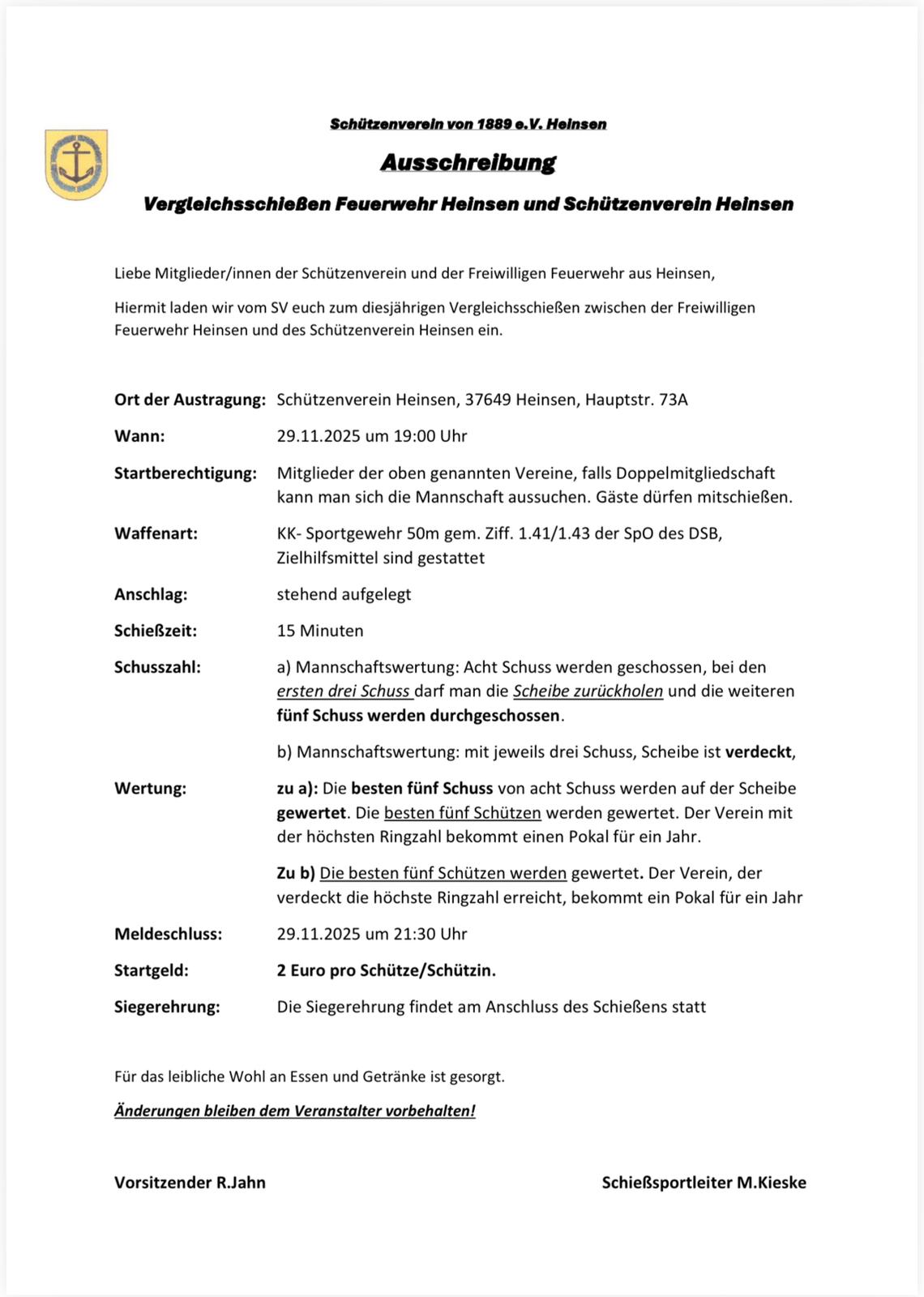 Vergleichsschießen der Feuerwehr und des Schützenvereins Heinsen Startseite / Veranstaltungen / This event has ended Date 29. November 2025 Time 19:00 📅 In Kalender übernehmen (ICS)