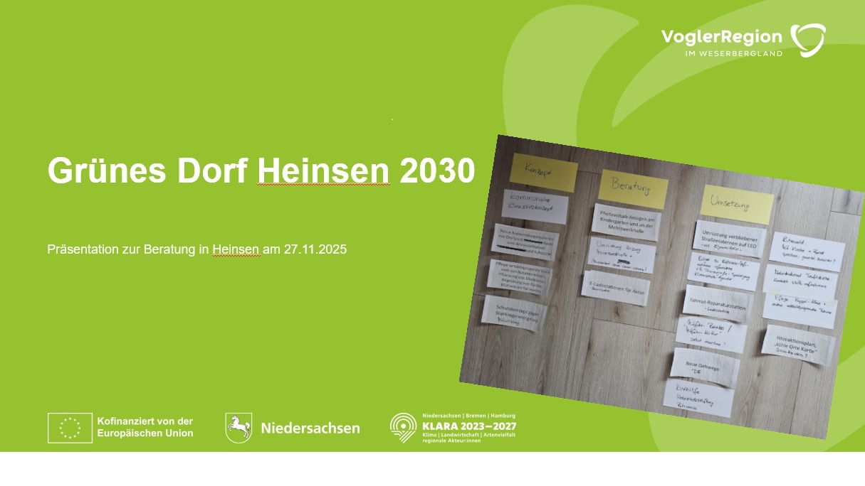 Am 27.11.2025 fand in der Gemeinde Heinsen eine Beratung durch den Landkreis Holzminden (vertreten durch Christine Bossow, Tessa Harries und Thomas Greger) zur Ideenwerkstatt „Grünes Dorf Heinsen 2030“ statt.