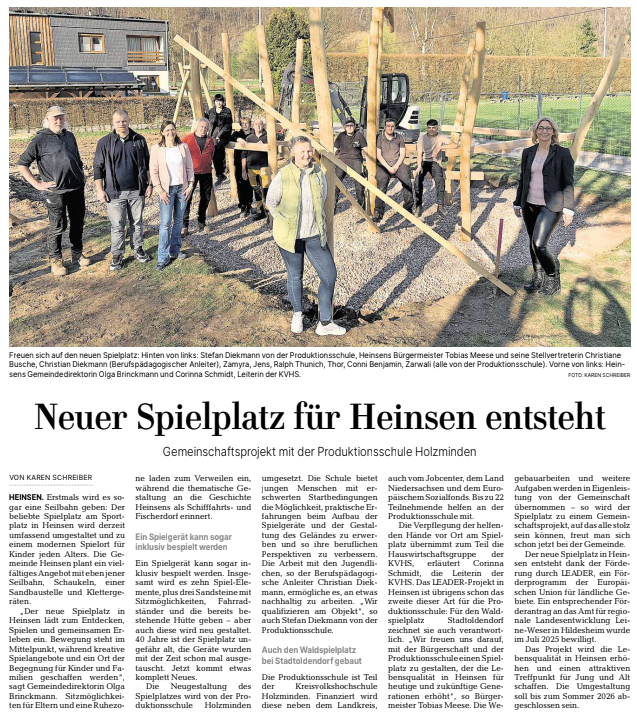 In Heinsen wird aktuell der Spielplatz am Sportplatz grundlegend erneuert und zu einem zeitgemäßen Treffpunkt für Kinder aller Altersgruppen ausgebaut. In Zusammenarbeit mit der Produktionsschule Holzminden entsteht ein abwechslungsreiches Angebot mit neuen Attraktionen wie einer Seilbahn, Schaukeln, einer Sandbaustelle und verschiedenen Klettermöglichkeiten. Die Umgestaltung des neuen Spielplatzes in Heinsen wird durch das EU-Förderprogramm LEADER unterstützt, das speziell für die Entwicklung ländlicher Regionen vorgesehen ist. Der dazugehörige Antrag beim Amt für regionale Landesentwicklung Leine-Weser in Hildesheim wurde im Juli 2025 erfolgreich genehmigt. Der dazugehörige Zeitungsartikel, verfasst von Karen Schreiber und veröffentlicht am 07.04.2026 in Täglichen Anzeiger Holzminden (online und gedruckt) erschienen, ist unter dem unten stehenden PDF einsehbar.