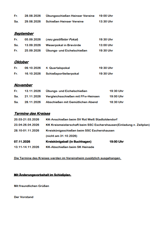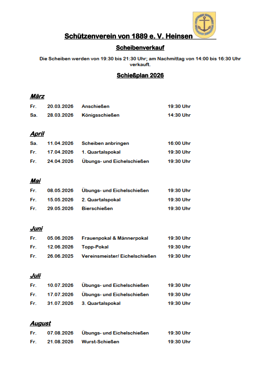 Schießplan 2026 des Schützenvereins e.V. Heinsen